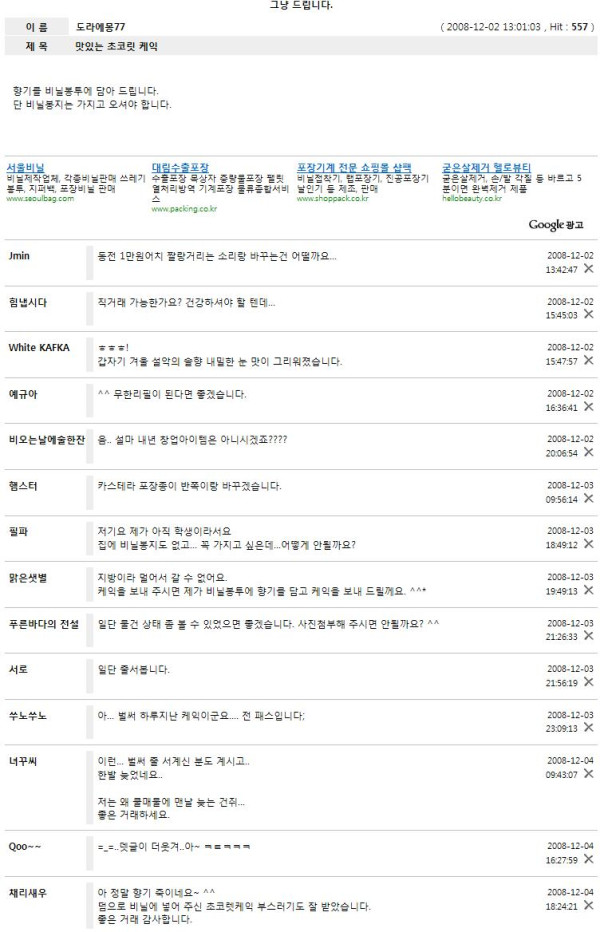 맛있는 초코렛케릭 향기 페이지 정보 작성자 마술피리 댓글 0건 조회 13,070회 작성일 09-07-14 17:50 목록 본문 페이스북 공유 트위터 공유 ㅋㅋㅋ 댓글 0 댓글목록 등록된 댓글이 없습니다.