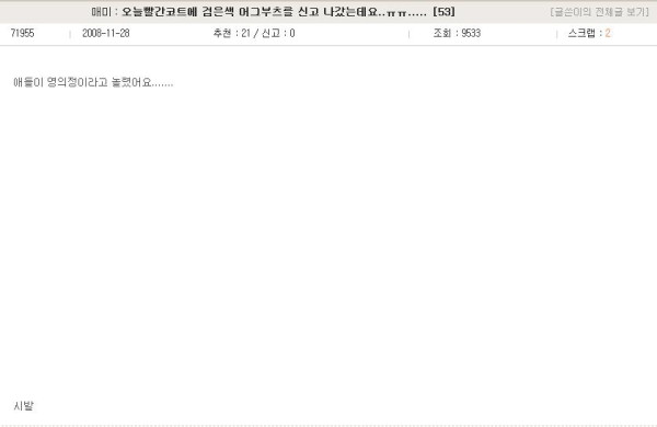 오늘은 빨간코드에 검은색 어그부츠를 코디하고... 페이지 정보 작성자 마술피리 댓글 0건 조회 14,871회 작성일 09-07-14 17:52 목록 본문 페이스북 공유 트위터 공유 ㅋㅋ 댓글 0 댓글목록 등록된 댓글이 없습니다.