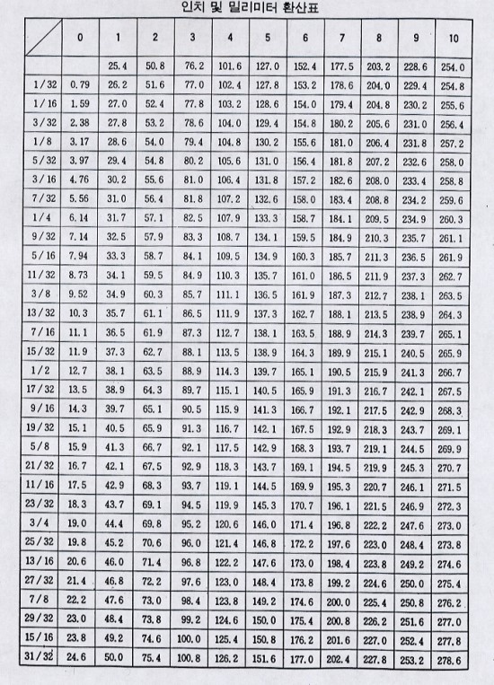 인치(Inch)와 밀리미터(Milimeter) 환산표